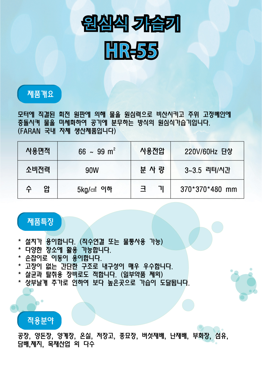 원심식가습기란? 모터에 직결된 회전 원판에 의해 물을 원심력으로 비산시키고 주위 고정배인에 충돌시켜 물을 미세화하여 공기에 분무하는 방식의 가습기 입니다. 모터에 직결된 회전 원판에 의해 물을 원심력으로 비산시키고 주위 고정베인에 충돌시켜 물을 미세화하여 공기에 분무하는 방식의 원심식가습기입니다. (FARAN 국내 자체 생산제품입니다)