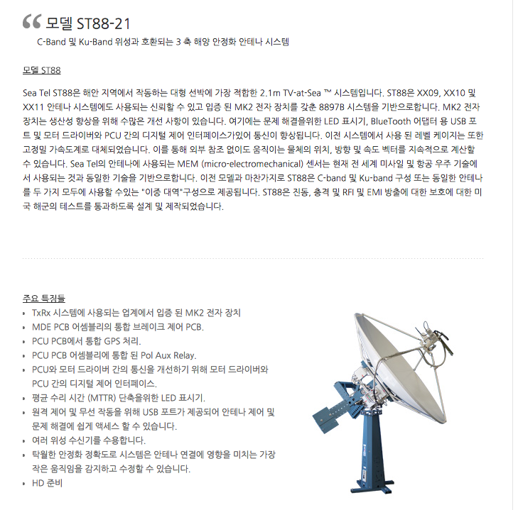 C-Band 및 Ku-Band 위성과 호환되는 3 축 해양 안정화 안테나 시스템