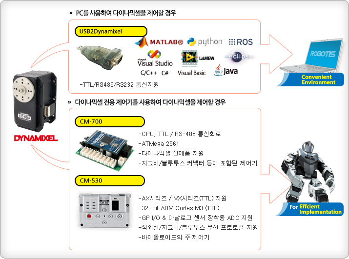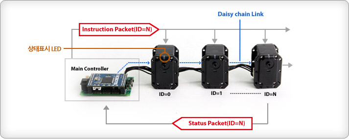 고유의 ID 를 가진 다이나믹셀들은 하나의 버스상에서 Packet 통신으로 제어되며, 모델에 따라 TTL, RS485 등의 네트워크
