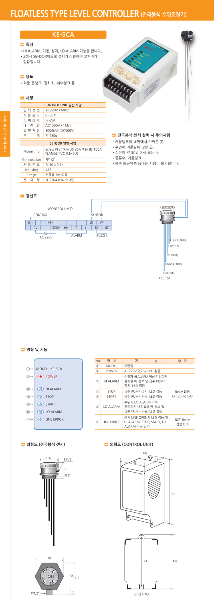 | 사양 | HI ALARM, 기동, 정지, LO ALARM 기능을 합니다. 2선식 SENSOR이므로 설치가 간편하여 설치비가 절감됩니다. | ||