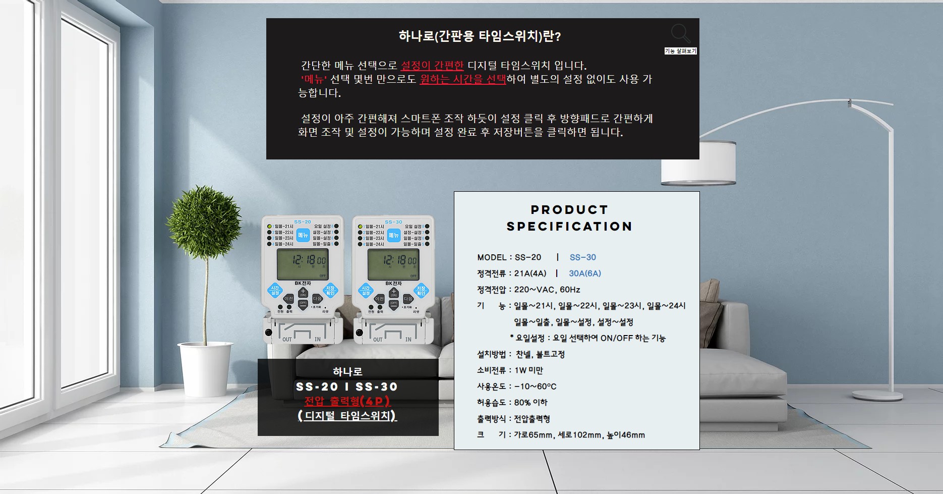 | 사양 | 간단한 메뉴 선택으로 설정이 간편한 디지털 타임스위치 입니다. | ||