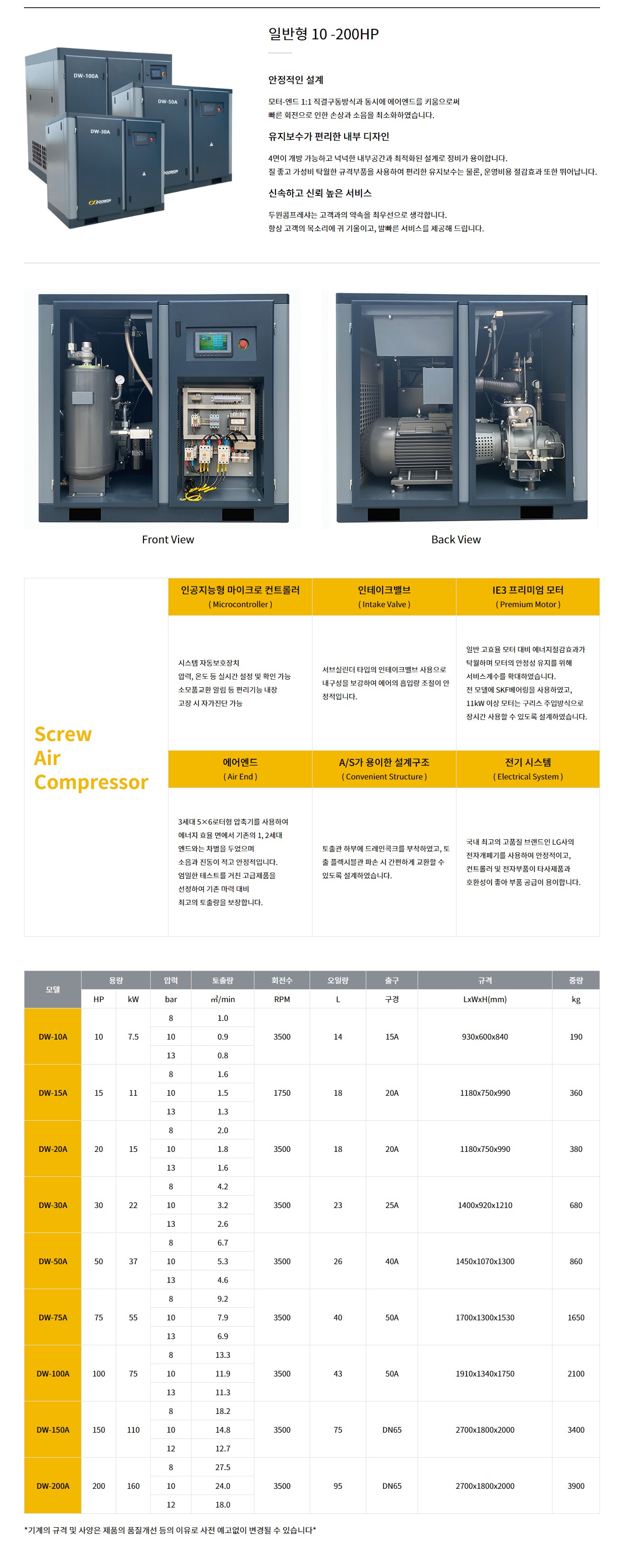 | 제품명 | 오일인젝션 스크류 – 일반형(Screw Air Compressors) | ||