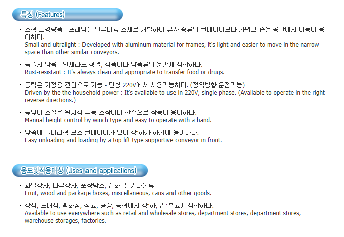 알루미늄 초경량 들머리형 포터블 컨베이어