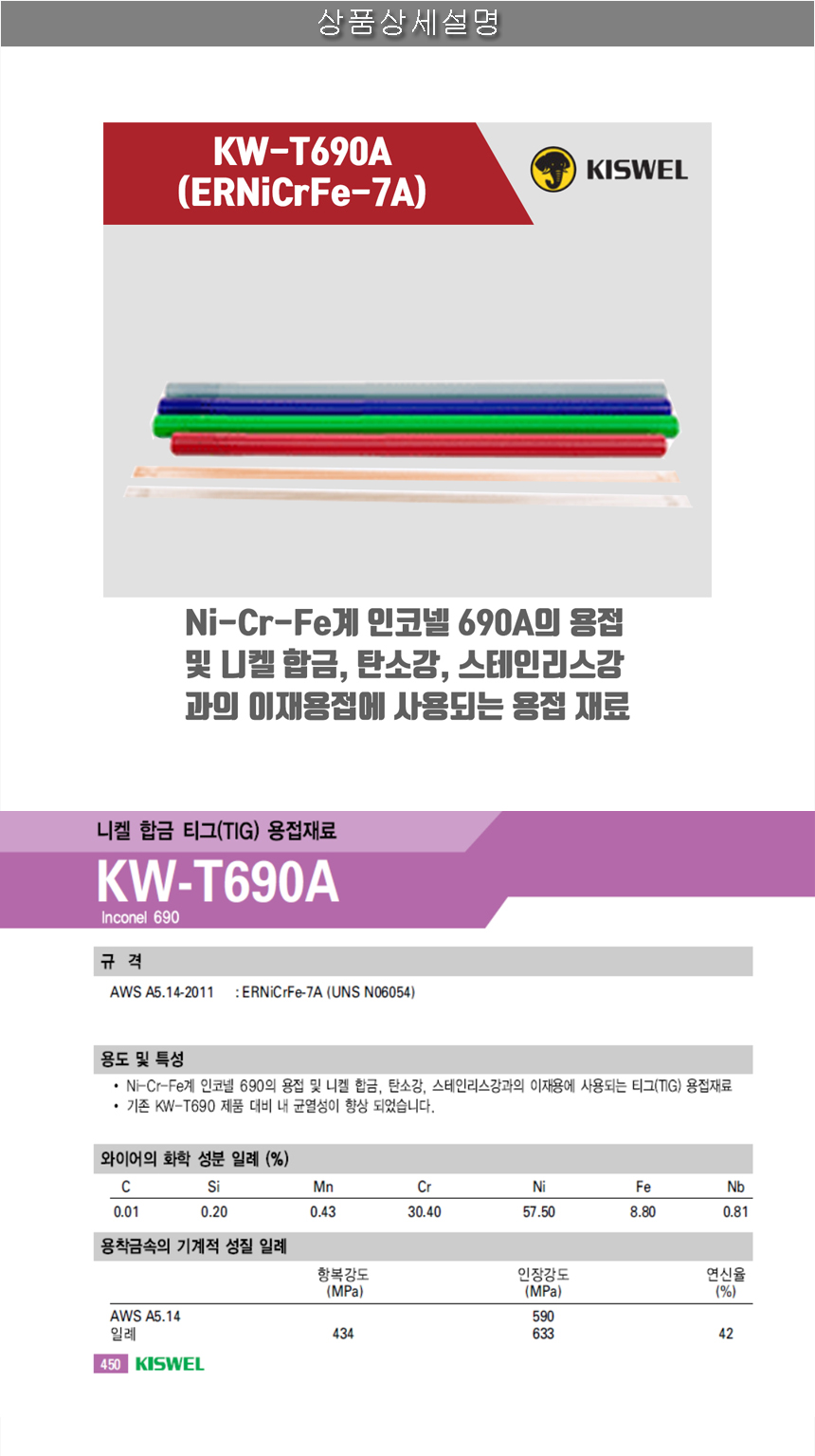 [고려용접봉] KW-T690A (ERNiCrFe-7A) 알곤 티그(Tig)용접봉 2.4mm (5kg)