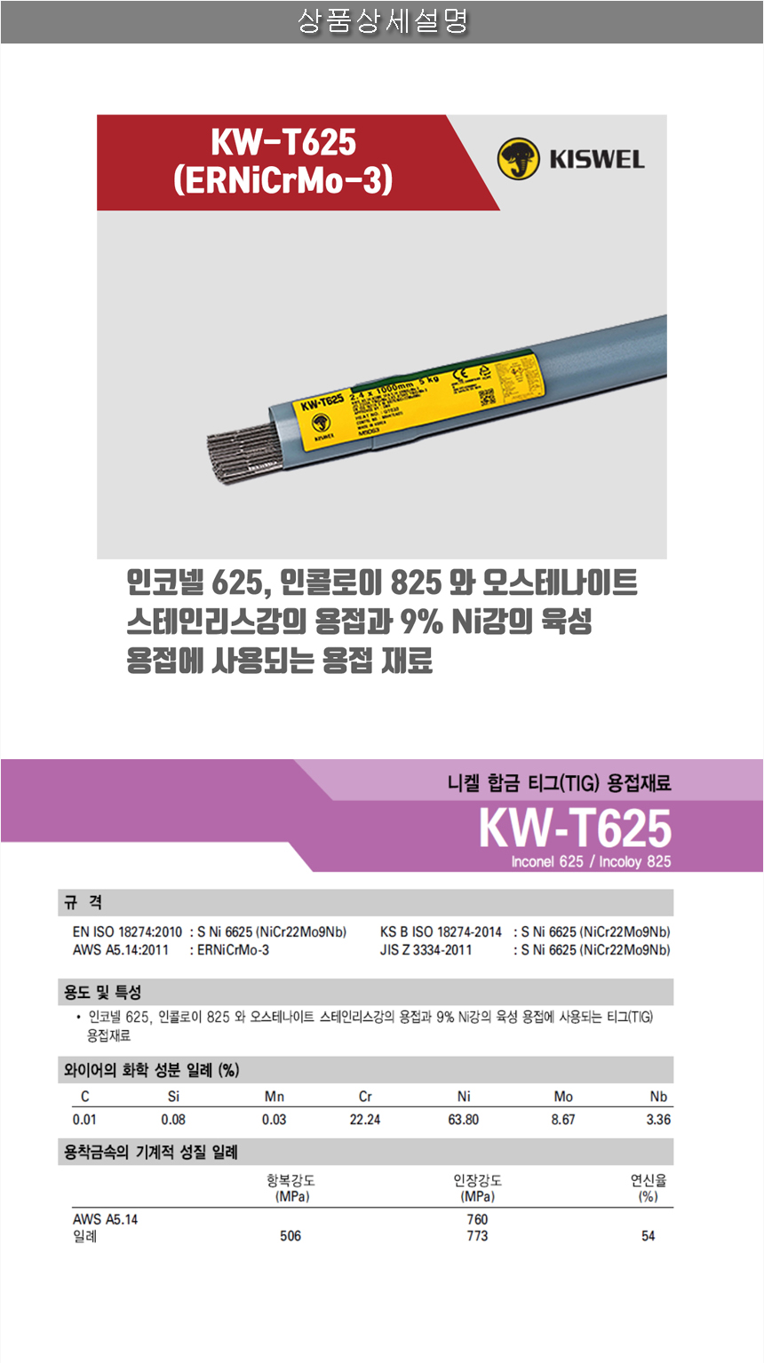 [고려용접봉] KW-T625 (ERNiCrMo-3) 알곤 티그(Tig)용접봉 2.0, 2.4, 3.2mm (5kg)