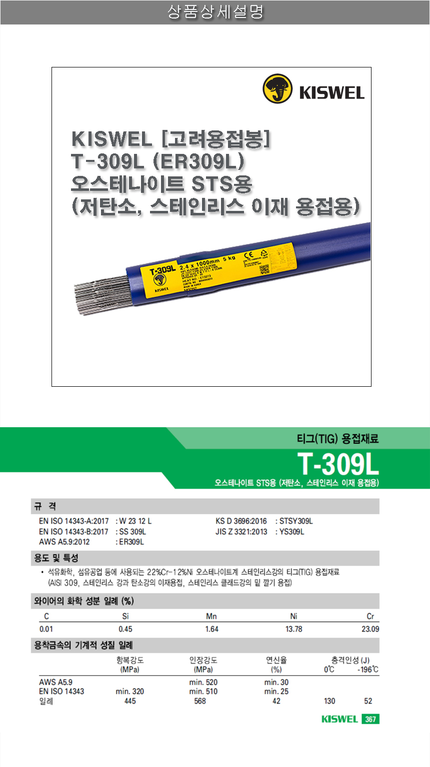 [고려용접봉] T-309L (ER309L) 알곤 티그(Tig)용접봉 1.2, 1.6, 2.0, 2.4, 3.2, 4.0mm (5kg)
