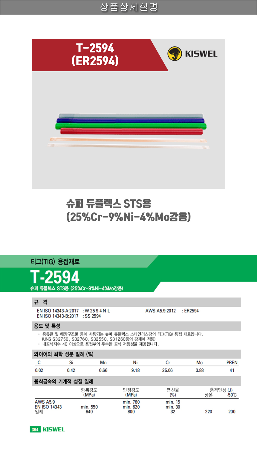 | 사양 | UNS S32750, S32760, S32550 그리고 S31260와 같은 듀플렉스 스테인리스에 적용 가능, 슈퍼 듀플렉스 스테인리스강은 내공식지수 40이상으로 우수한 공식 저항성과 내해수성을 제공 |