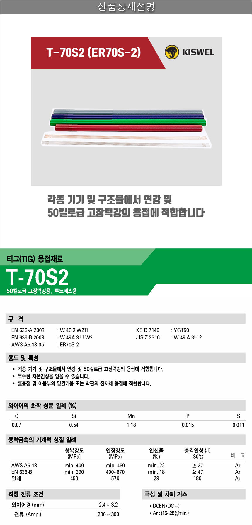 [고려용접봉] T-70S2 (ER70S-2) 알곤 티그(Tig)용접봉 2.0, 2.4mm (5kg)