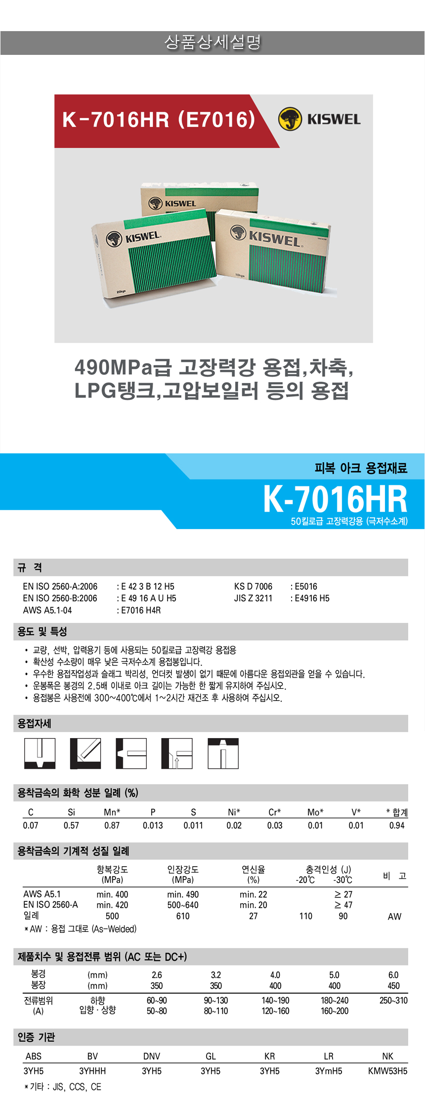490MPa급 고장력강 용접, 선박, 차축, LPG탱크, 고압보일러 등의 용접, 고유황강의 용접