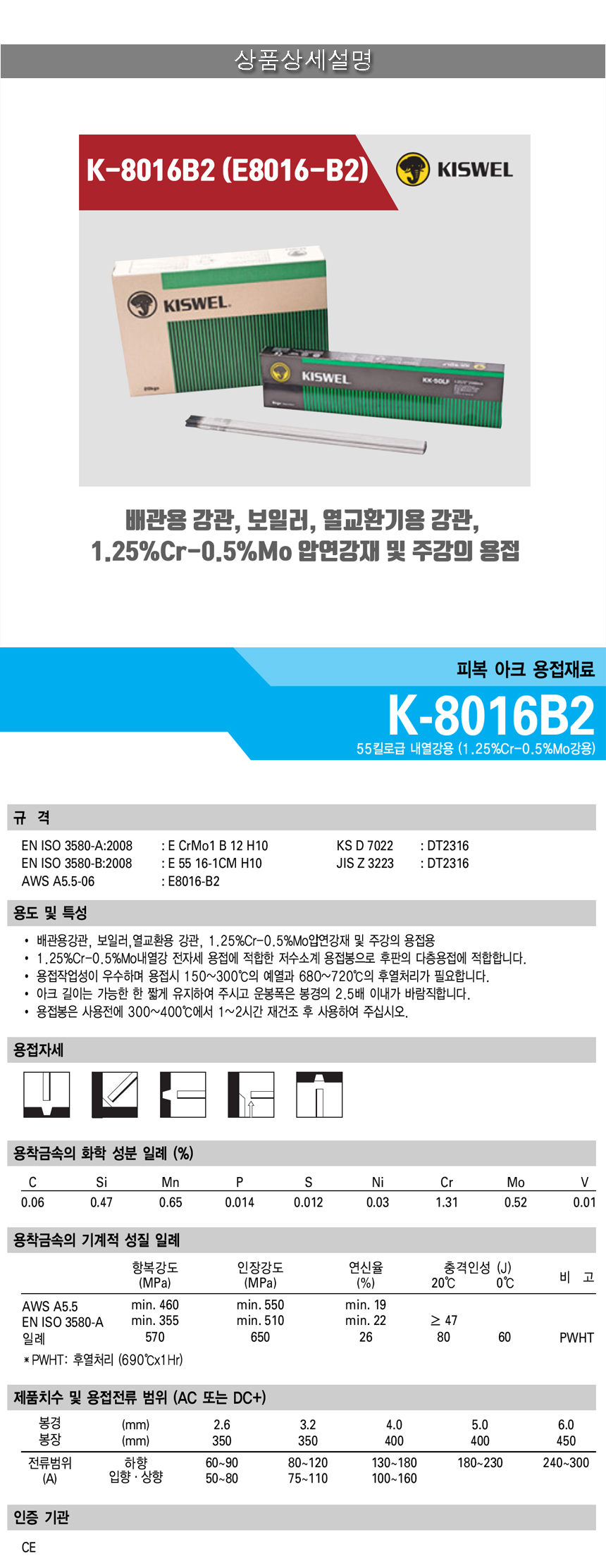 [고려용접봉] K-8016B2 (E8016-B2) 피복아크 용접봉 3.2, 4.0, 5.0mm (5kg)