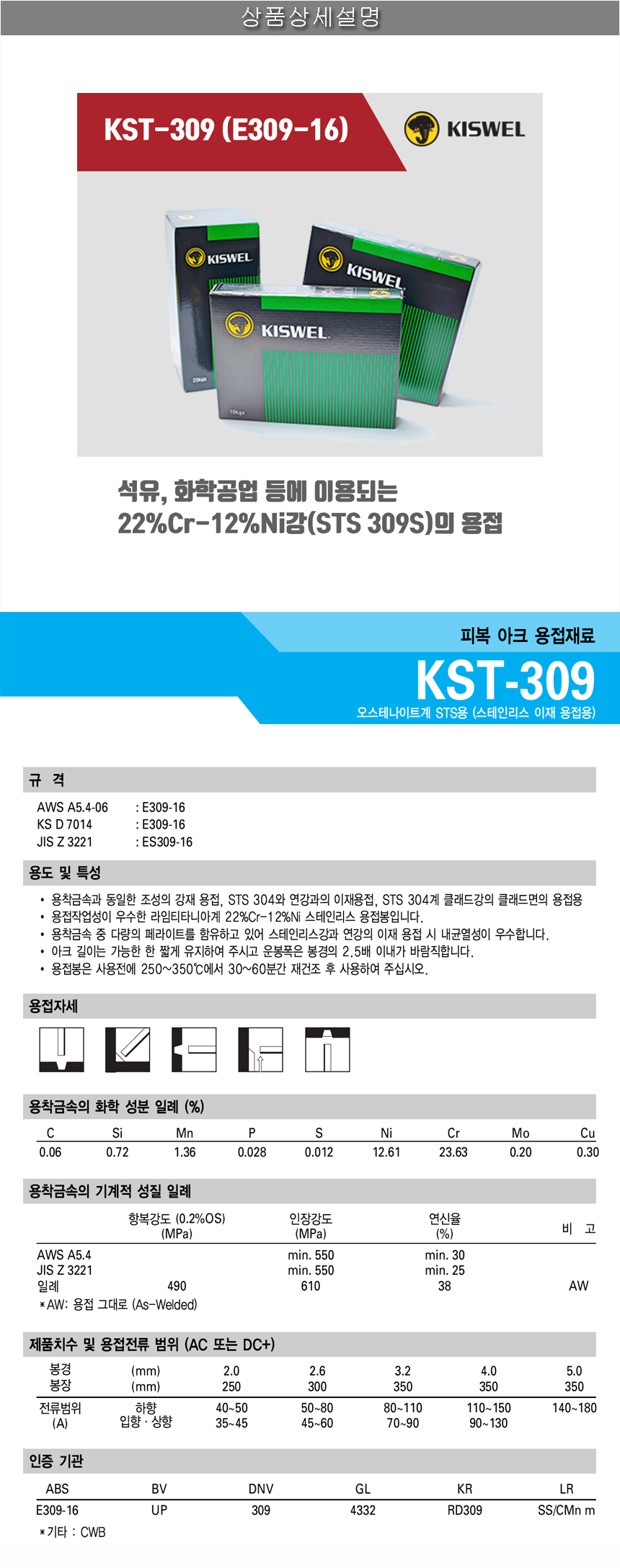 | 사양 | 석유, 화학공업 등에 이용되는 22%Cr-12%Ni강(STS 309S)의 용접, STS 304와 연강이나 저합금강의 이종금속용접, STS 304계 클래드강의 클래드면의 용접 |