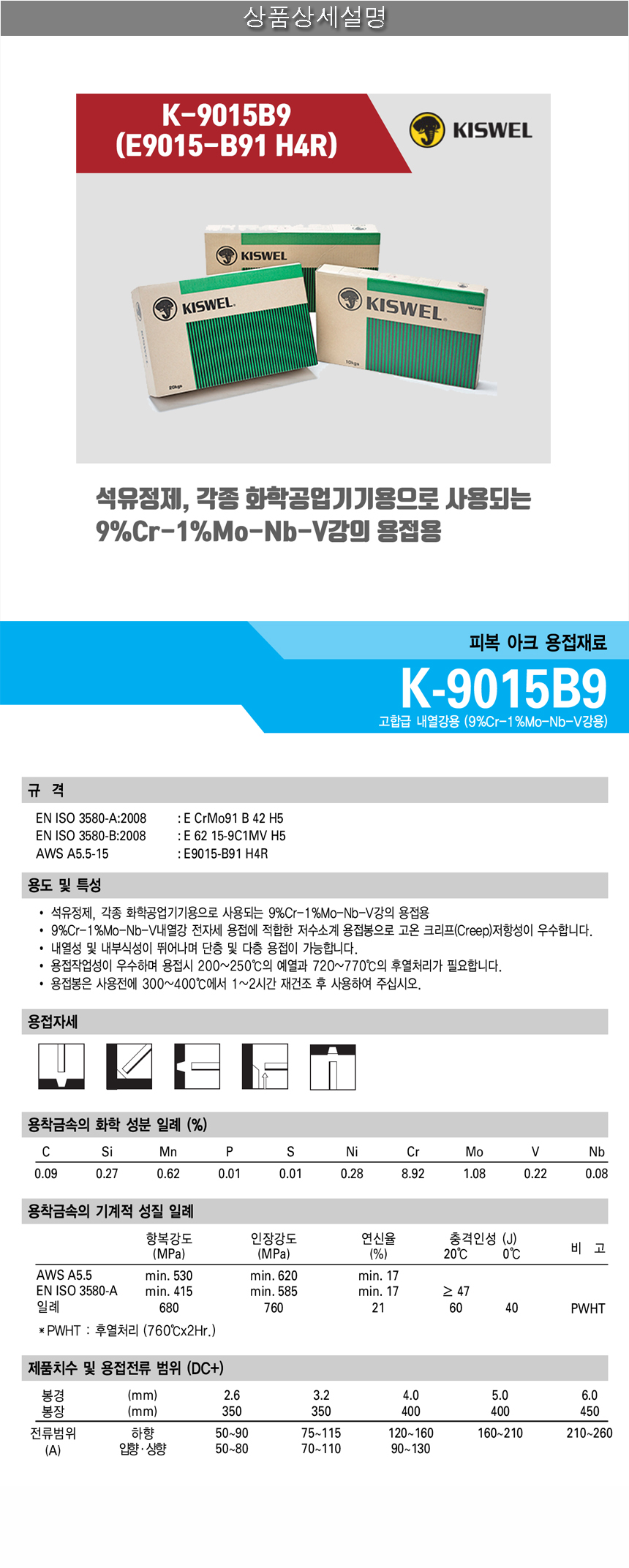 석유정제, 각종 화학공업기기용으로 사용되는 9%Cr-1%Mo-Nb-V강의 용접용