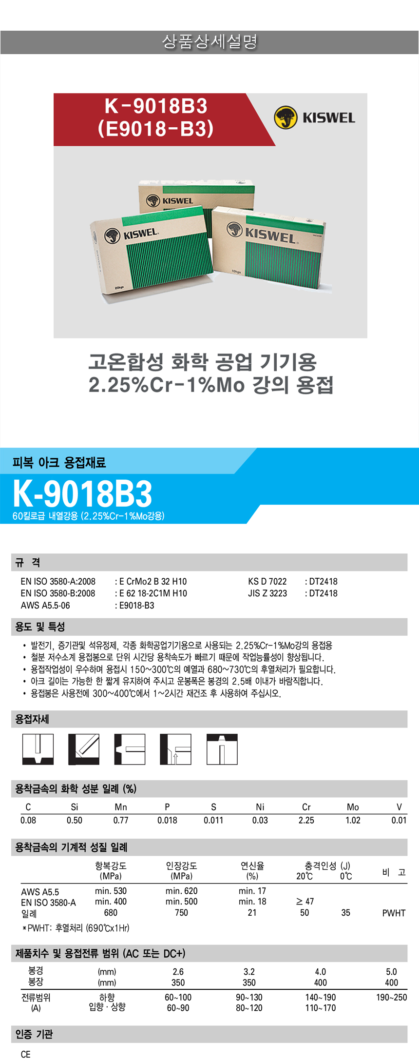 발전기, 보일러의 과열관, 증기관 및 석유정제, 고온합성 화학 공업 기기용 2.25%Cr-1%Mo 강의 용접